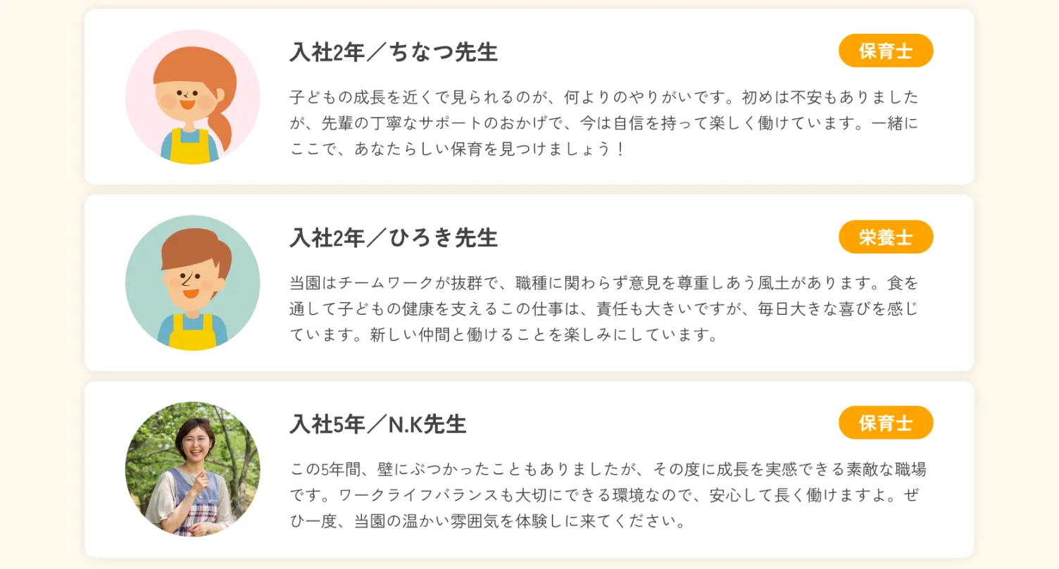 求職者と保育園のミスマッチを防ぐため、園の雰囲気や働き方を動画やインタビューで丁寧に伝えます。求職者が入職前に園の実情をしっかり理解できるため、定着率の向上が期待できます。
